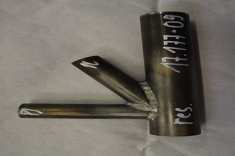 Das Prüfstück TP5 ist ein Rohrknoten. Dessen Fertigung dient als Nachweis der Fähigkeit des Prüflings, komplexe Rohrgeometrien zu schweißen.