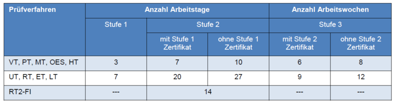 Oftmals wird ein Zertifikat der Prüfer gemäß DIN EN ISO 9712 gefordert. Dessen Erlangung durch eine Zertifizierstelle erfordert neben persönlichen Voraussetzungen und bestandener Prüfung einen Nachweis der Schulungsstunden des Prüflings. Die Schulungsstunden hängen unter anderem von seinem Bildungsweg ab: Für Ingenieure, Techniker und Meister besteht die Möglichkeit, an verkürzten Lehrgängen teilzunehmen. Liegen bereits Zertifikate vor, kann die Anerkennung durch die Personenzertifizierstelle des TÜV Nord geprüft werden.