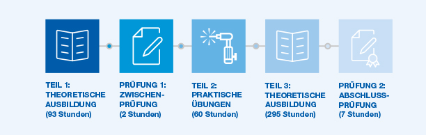 Im Rahmen des Teils 1 werden zunächst Grundlagen vermittelt, um die unterschiedlichen Niveaus der Teilnehmer auszugleichen. Teil 1 kann auch komplett als e-learning abgewickelt werden. Im Anschluss an Teil 1 erfolgt die obligatorische Zwischenprüfung, die im Multiple Choice- Verfahren durchgeführt wird.